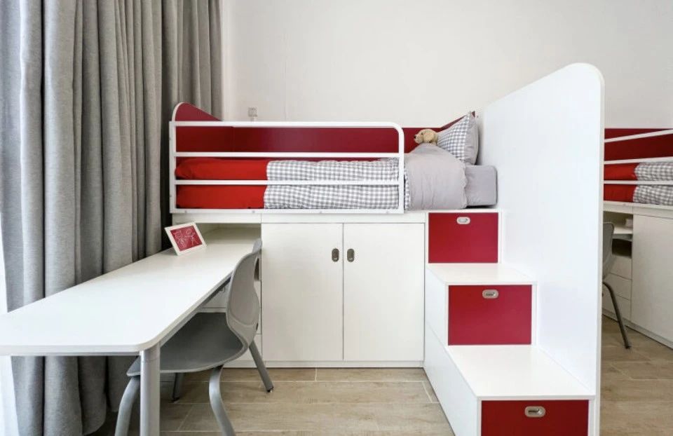 更关键的是,学校还根据学生成长不同阶段为寄宿生打造了不同的公寓空间,如低年级的四人间,高年级的二人间,均配备高颜值的独立睡眠区和生活区,同时配置宿舍活动室,丰富学生课余生活。