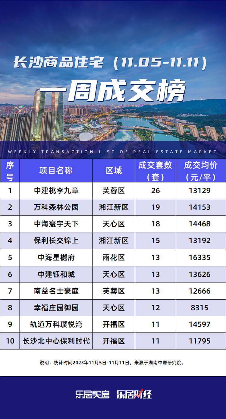 其中位于榜单前三位的分别为芙蓉区的中建桃李九章、岳麓区的万科森林公园、天心区的中海寰宇天下,分别成交26套、19套、18套,成交金额分别为0.45亿、0.40亿、0.36亿。