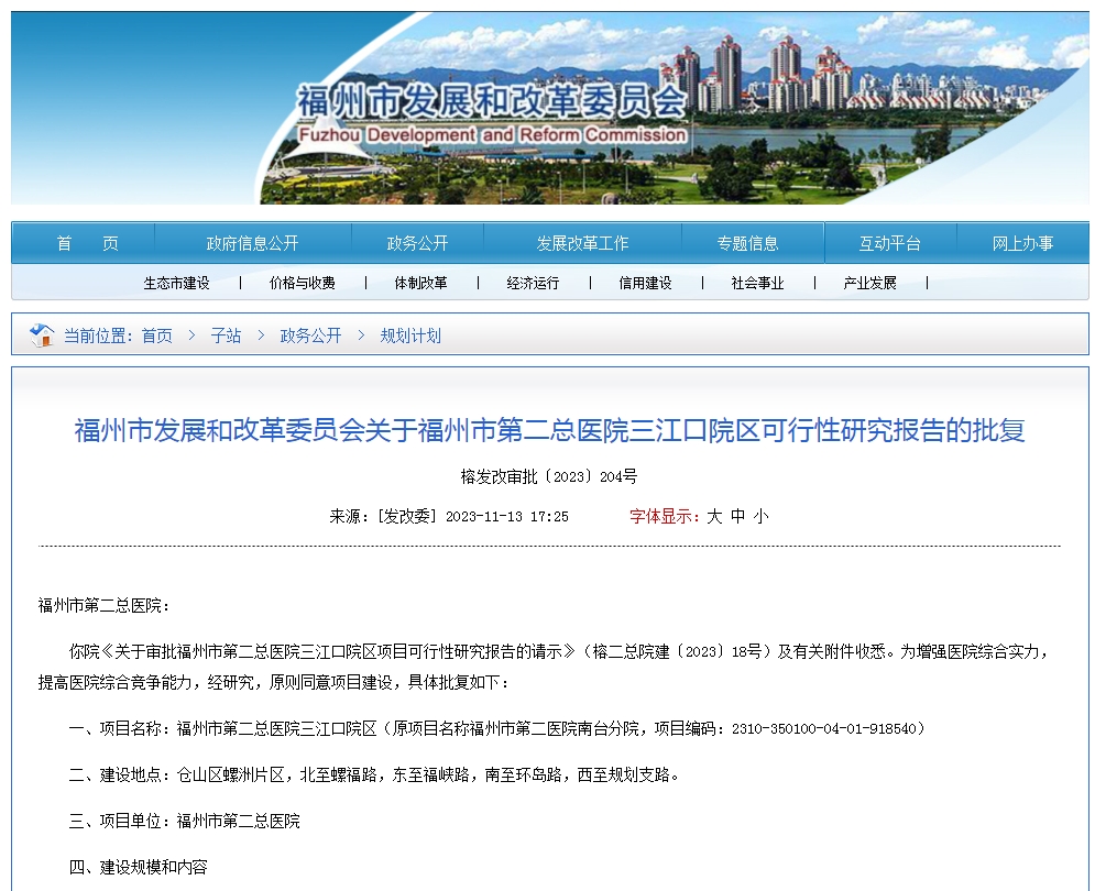 11月9日,福州市发改委官网发布《福州市发展和改革委员会关于福州市第二总医院三江口院区可行性研究报告的批复》,为增强医院综合实力,提高医院综合竞争能力,经研究,原则同意项目建设。