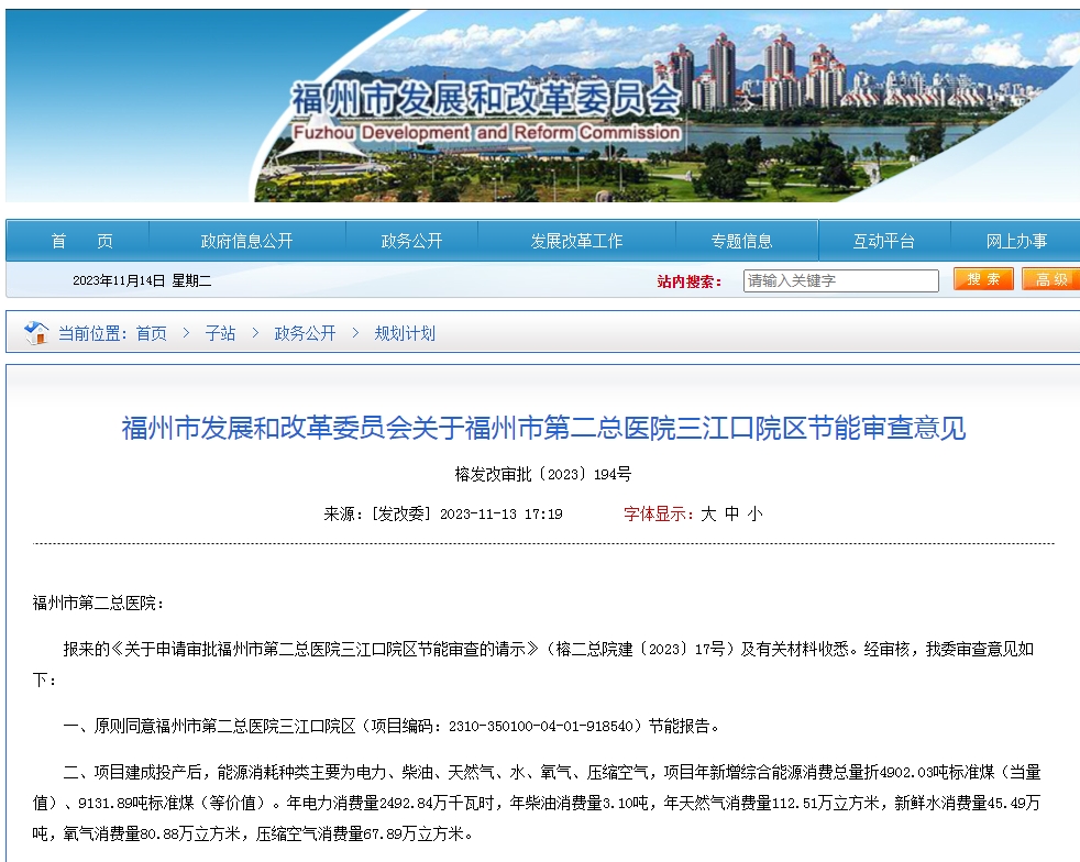此外,11月6日福州市发展和改革委员会还通过了《福州市发展和改革委员会关于福州市第二总医院三江口院区节能审查意见》。项目建成投产后,能源消耗种类主要为电力、柴油、天然气、水、氧气、压缩空气,项目年新增综合能源消费总量折4902.03吨标准煤(当量值)、9131.89吨标准煤(等价值)。年电力消费量2492.84万千瓦时,年柴油消费量3.10吨,年天然气消费量112.51万立方米,新鲜水消费量45.49万吨,氧气消费量80.88万立方米,压缩空气消费量67.89万立方米。