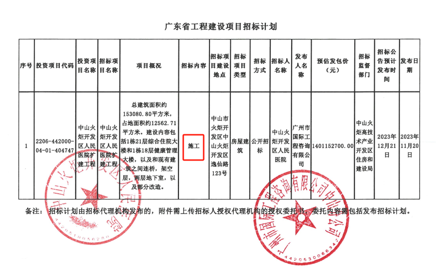11月20日,中山公共资源交易中心发布多则工程招标计划公告,其中就包含了“中山火炬开发区人民医院扩建工程”。