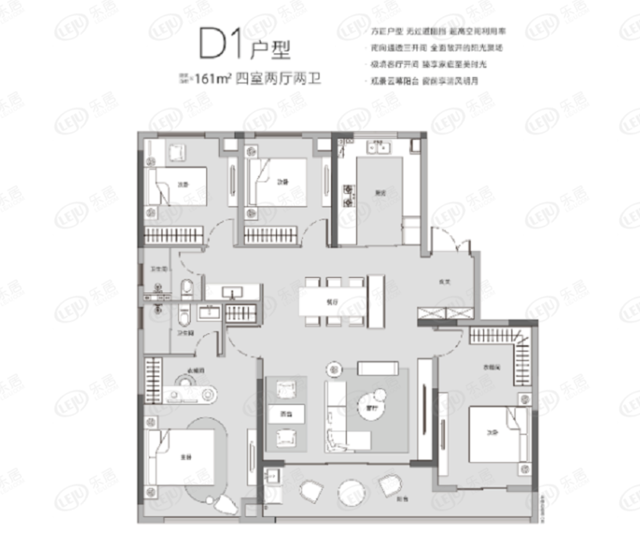 建面约161平米四房两厅两卫,方正户型,无过道阻挡,超高空间利用率;南向通透三开间,全面敞开的阳光聚场;极境客厅开间,臻享家庭至美时光;观景云慕阳台,窗前享清风明月。