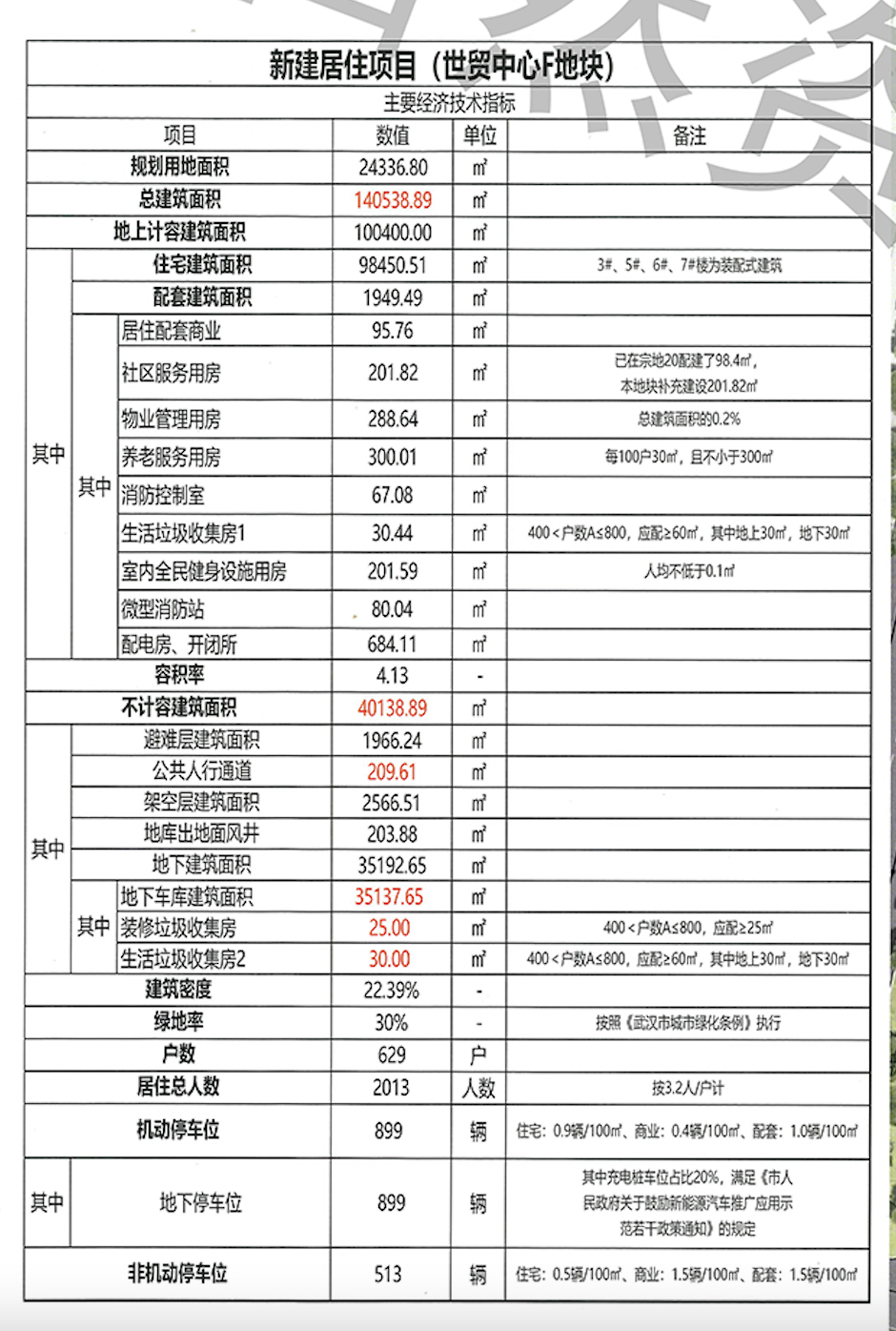 根据规划,地块规划用地面积24336.8平方米,总建筑面积140538.89平方米,住宅建筑面积98450.51平方米。地块建筑密度22.39%,绿地率30%,规划629户,机动停车位899辆(均为地下停车位),另非机动停车位513辆。