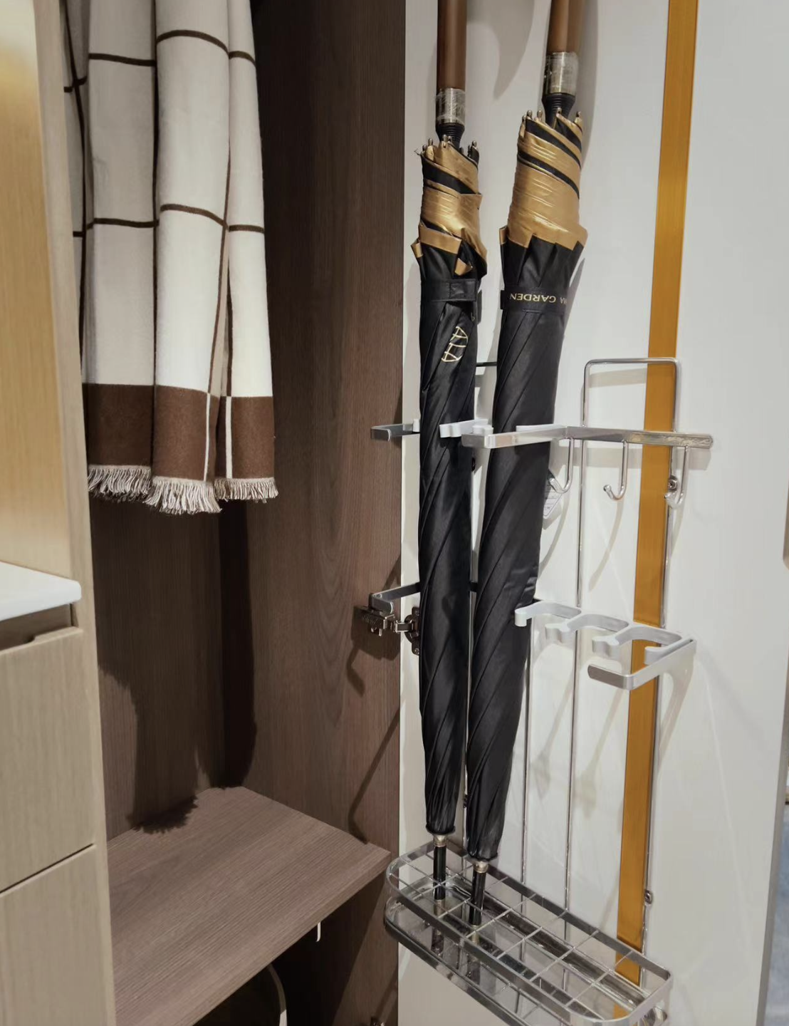 首先,进门的玄关柜,设计了伞架和置物架,下雨天也不会把室内弄的潮湿。
