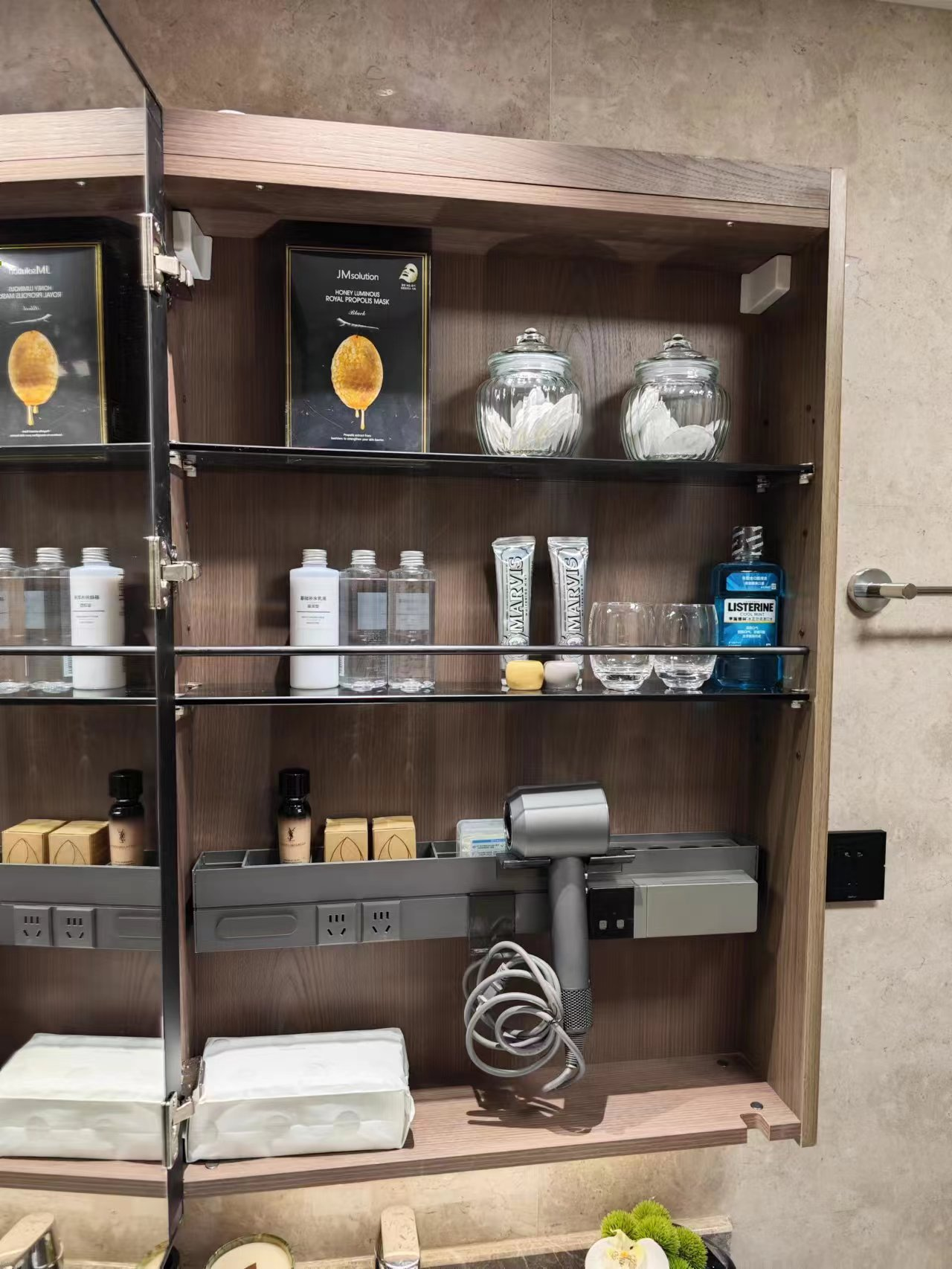卫生间镜柜内部插座面板,让吹风机、电动牙刷、冲牙器、电动剃须刀众多设备内置,保证美观度等等。