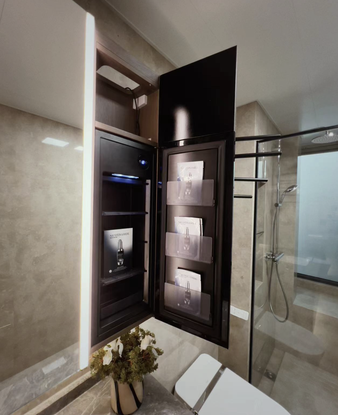 然后打开主卫的镜柜,还配置了镜柜美妆冰箱,方便女主人储物各种面膜,化妆品等物件。
