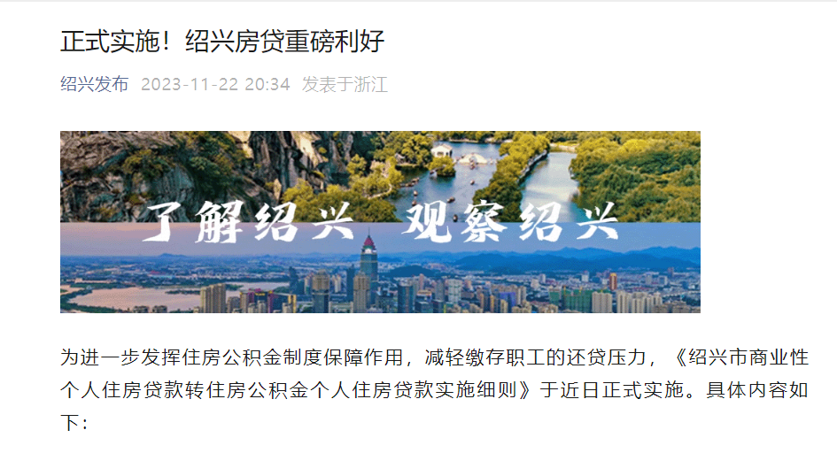 昨天,据绍兴发布消息,《绍兴市商业性个人住房贷款转住房公积金个人住房贷款实施细则》于近日正式实施。