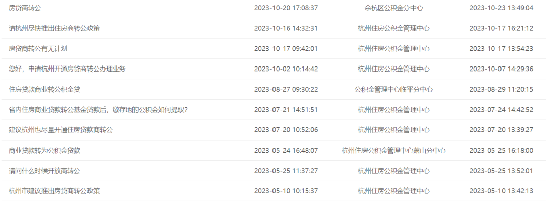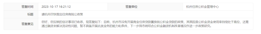 官方给出的答复基本一致:目前,杭州市没有开展商业住房贷款置换转公积金贷款的政策,其原因是公积金资金使用率持续处于高位,还需通过融资来解决流动性问题,暂不具备开展此类业务的能力和条件,下一步我市将结合公积金融资机制改革情况作进一步政策研究。