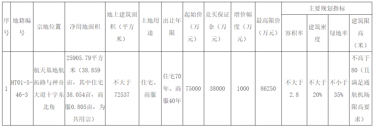 地块编号HT01-5-46-3,地块位于航天基地航拓路与神舟大道十字东北角,净用地面积25905.79平方米(38.859亩,其中住宅38.054亩,商服0.805亩,为共用宗)。