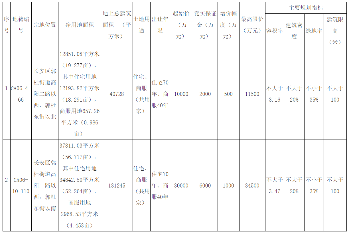 长安两宗地挂牌出让中,11月27日挂牌截止。宗地一地块编号CA06-4-66,地块位于长安区郭杜街道高阳二路以西,郭杜东街以北,净用地面积12851.08平方米(19.277亩),其中住宅用地12193.82平方米(18.291亩),商服用地657.26平方米(0.986亩)。