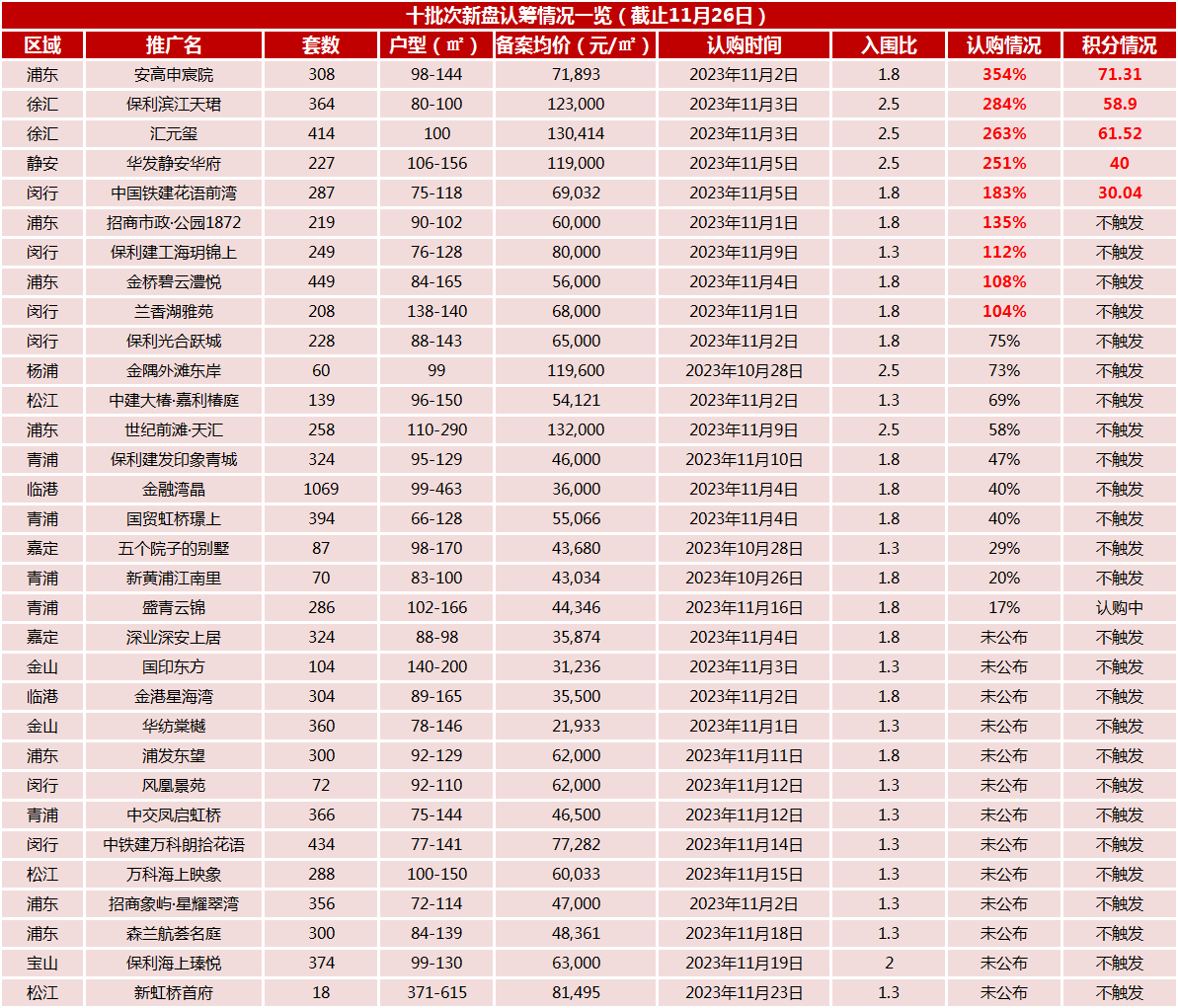 截至目前,十批次32盘均已认购完毕,从整体表现来看颇为冷淡,共计9盘认购率突破100%,占比不足3成,其中触发积分项目仅有5个,徐汇滨江等区域的入围分更是急转直下。