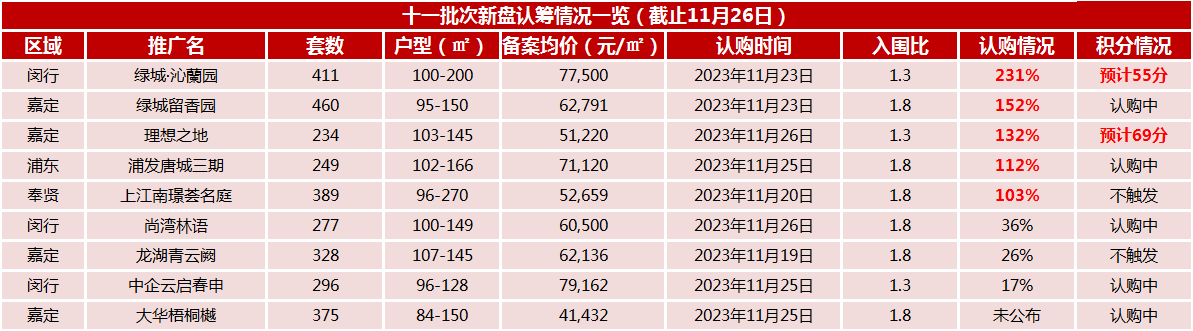 十一批次中已有9盘开启认购,超半数项目认购还未结束,但已有5盘认购率破百,2盘触发积分,整体迎来明显回暖迹象。