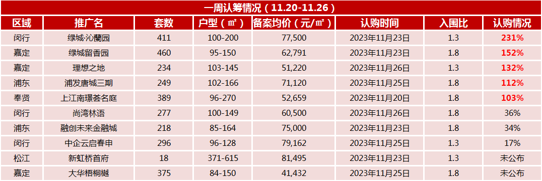 本周10个开启认购的项目中,认购率最高的来自于闵行的绿城沁蘭园,项目首开411套房源,吸引了950+组客户的认筹,最终认购率高达231%,触发积分,预计55分左右。