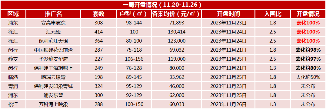 本周(11.20-11.26)开盘项目同样有10个,唐镇的热盘以及徐汇双子星开盘即“日光”,还有闵行静安等区域的红盘项目去化率在80%以上,整体市场表现有所回温。