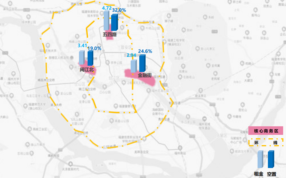 写字楼租金与空置情况看,2022第四季度,福州甲级子市场租金与空置率,均为五四路最高,租金为4.72元/㎡/天,空置率则为32%。此外,闽江北和金融街写字楼空置率也有19%以及24.6%。