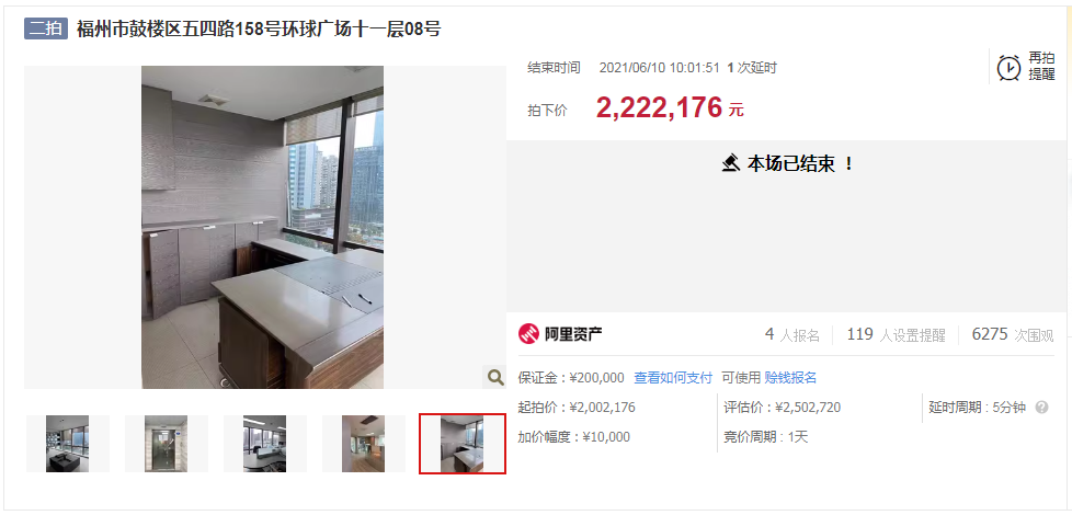 从最近的一次环球广场在阿里法拍成交记录来看,2021年6月10日,项目一套11层的156.42㎡房源,经过13轮竞价顺利成交,成交价222.2万,单价1.42万/㎡。