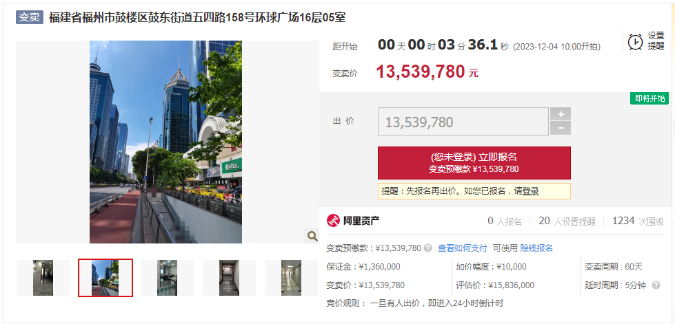 近段时间,环球广场频现二手商办房源被低价上架法拍平台。日前,阿里法拍平台就上架了一套环球广场16层1052㎡,起拍价约1354万房源,折合单价仅12870元/㎡。