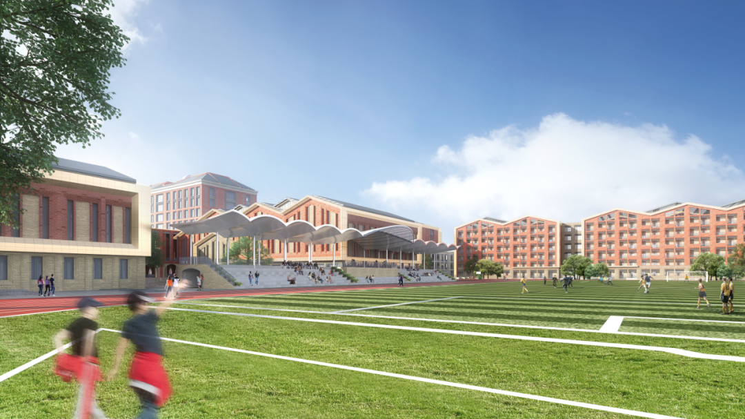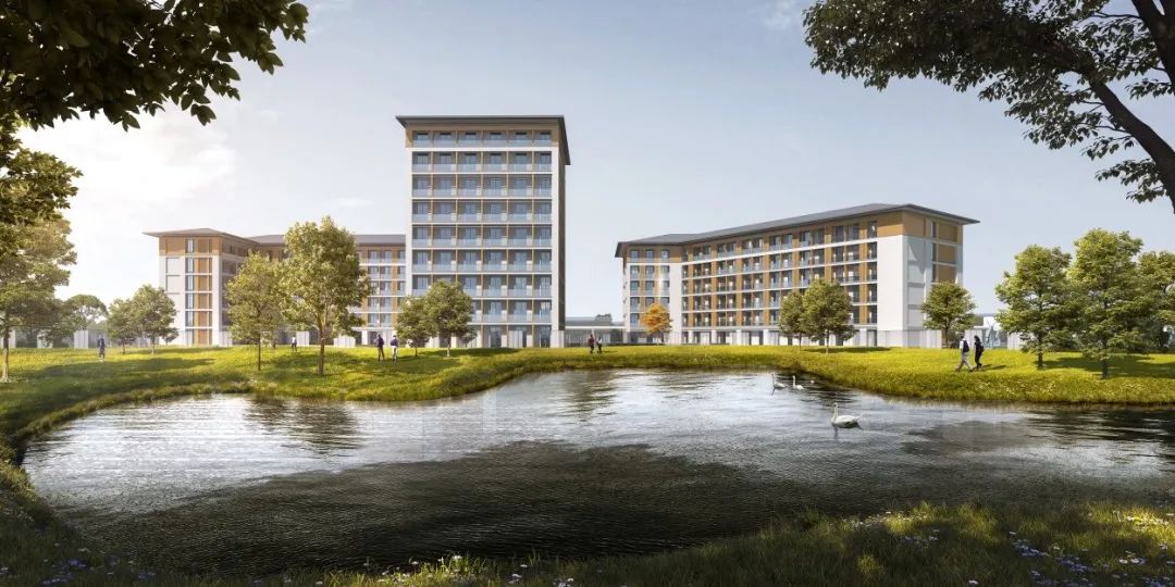 将传统坡顶作现代化和国际化处理以一晕春江涟漪为主题的屋顶体系统合了整个校园天际轮廓外墙色彩将采用灰白色及暖木色系