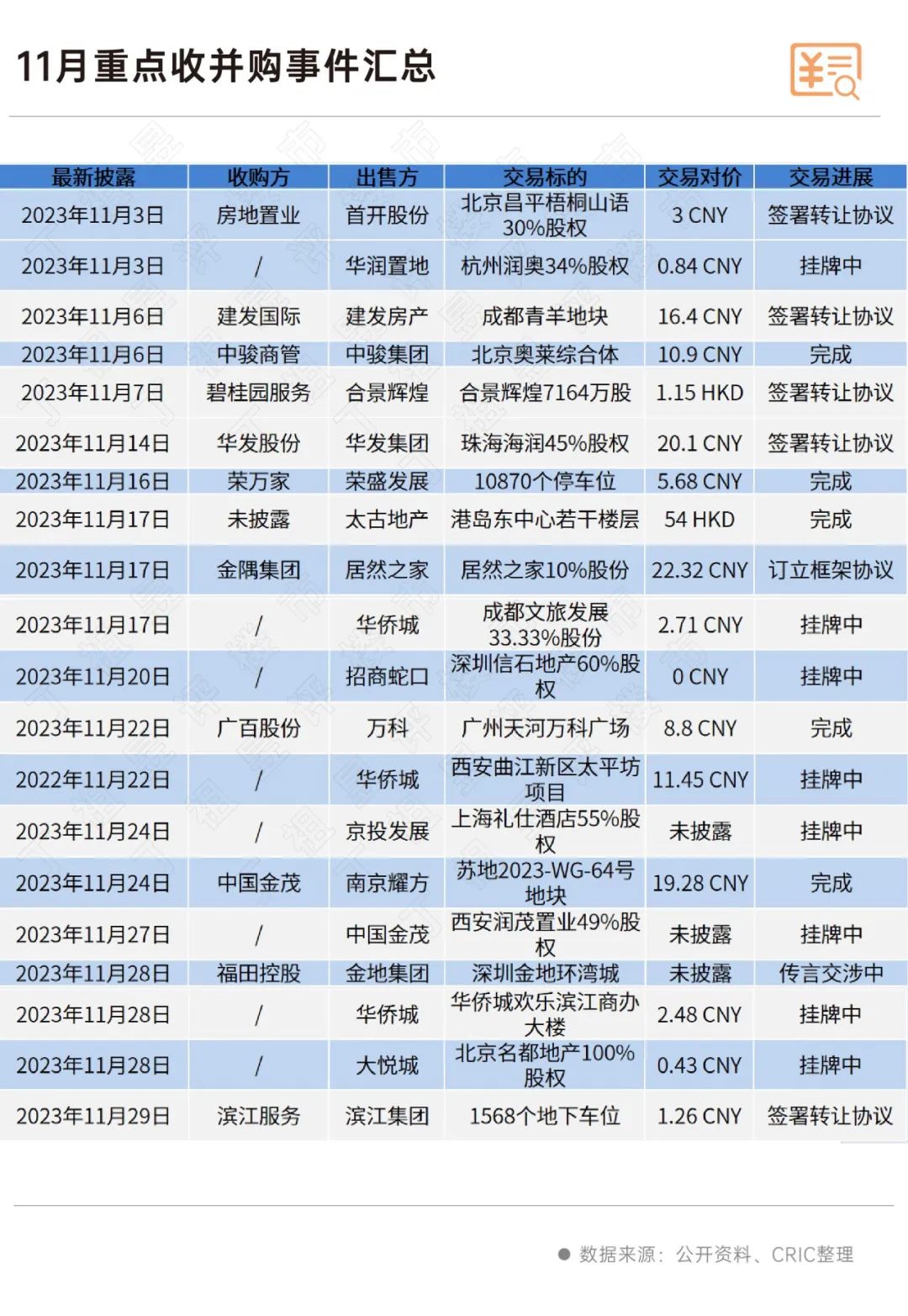 根据CRIC监测,11月重点监测房企并购交易共计24笔,已披露的总交易对价约200.5亿元,环比增加61.2%。