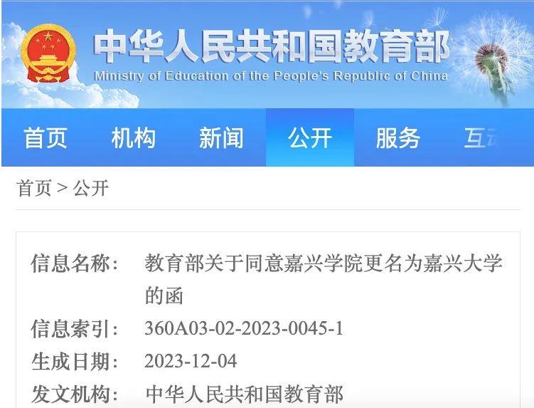 《浙江省人民政府关于商请将嘉兴学院更名为嘉兴大学的函》(浙政函〔2023〕22号)收悉。根据《中华人民共和国高等教育法》《普通高等学校设置暂行条例》《普通本科学校设置暂行规定》有关规定以及第八届全国高等学校设置评议委员会评议结果,经教育部党组会议研究决定,同意嘉兴学院更名为嘉兴大学,学校标识码为4133010354;同时撤销嘉兴学院的建制。现将有关事项函告如下。