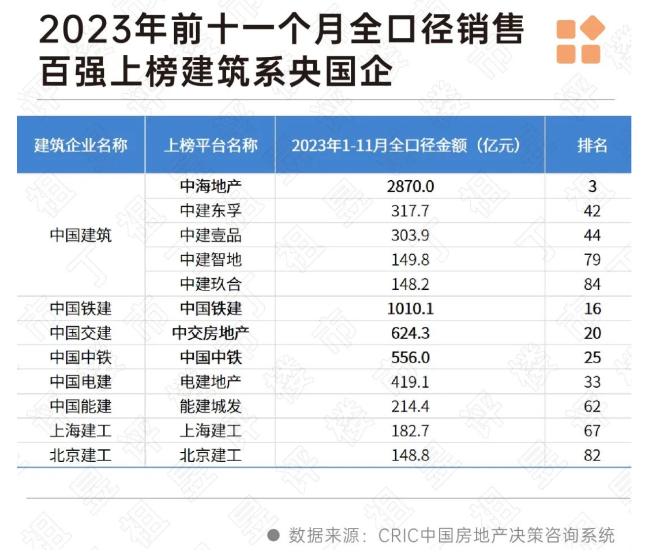 根据CRIC新增货值榜显示,2022年、2023年1-11月多家“建筑系”央国企连续入榜。