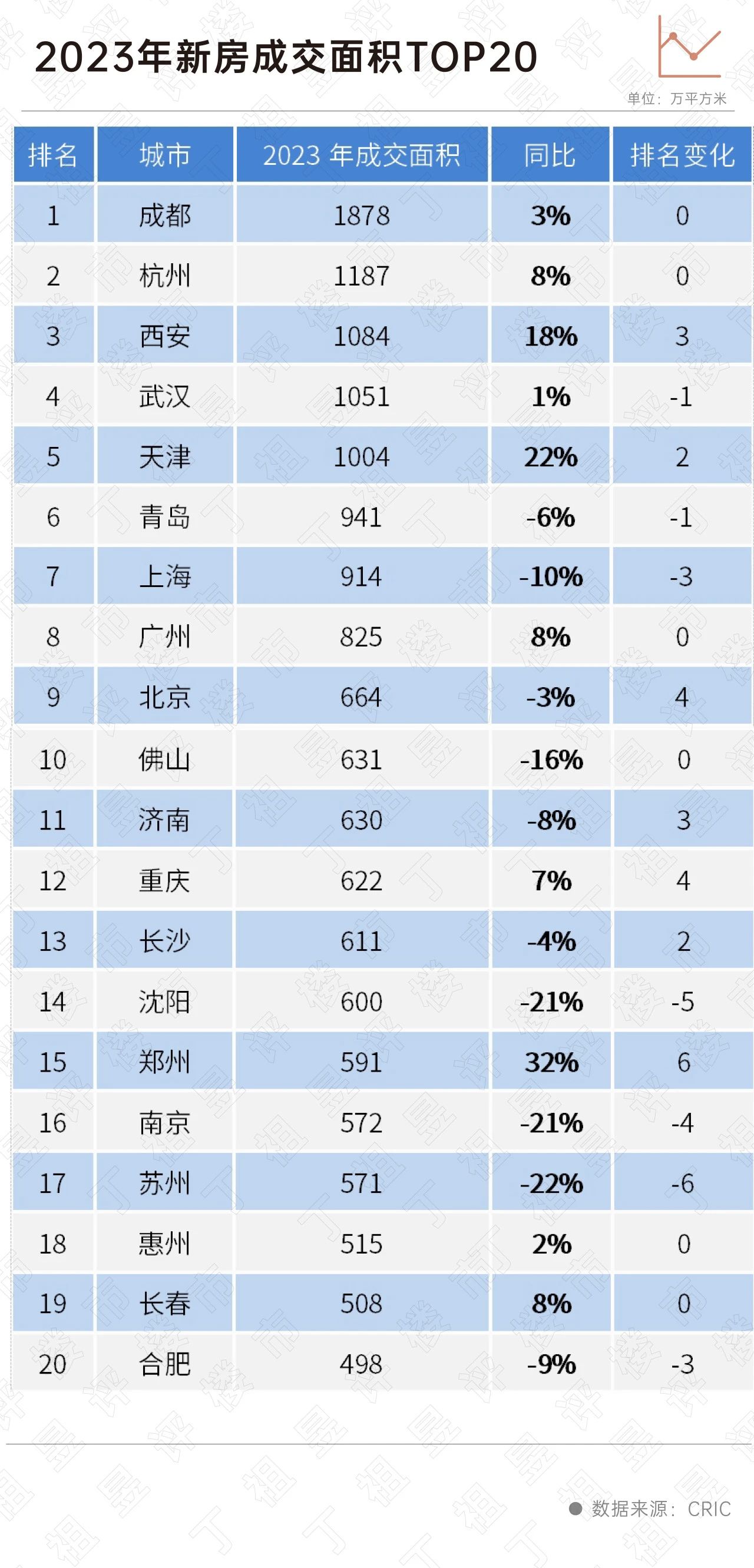 2023年,新房成交面积最高的是成都,全年成交面积达到1878万平方米,同比增加3%。值得注意的是,TOP5城市成交面积均突破千万平方米。