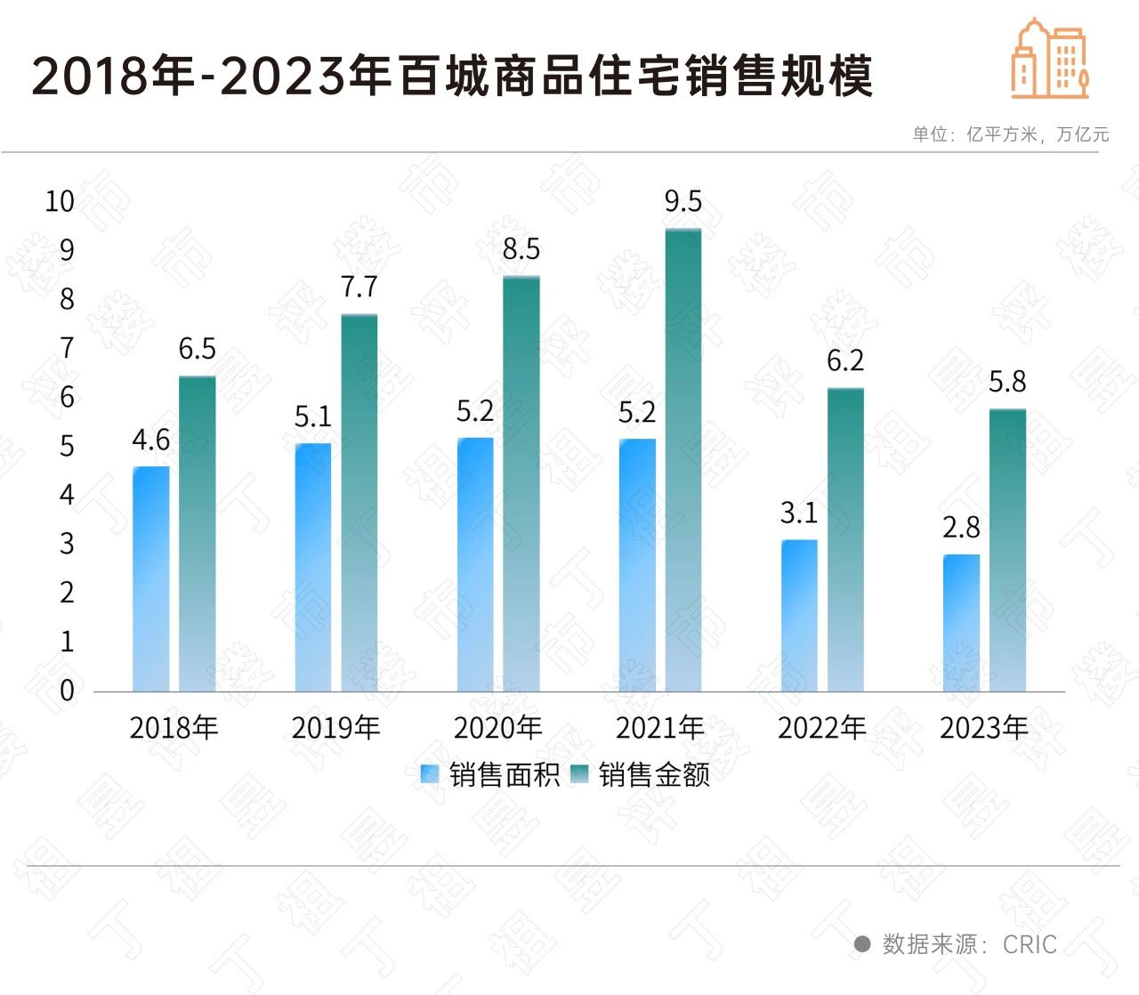 具体数据来看,2023年百城新建商品住宅成交面积为2.8亿平方米,同比下降10%;新建商品住宅成交金额为5.8万亿元,同比下降5%。
