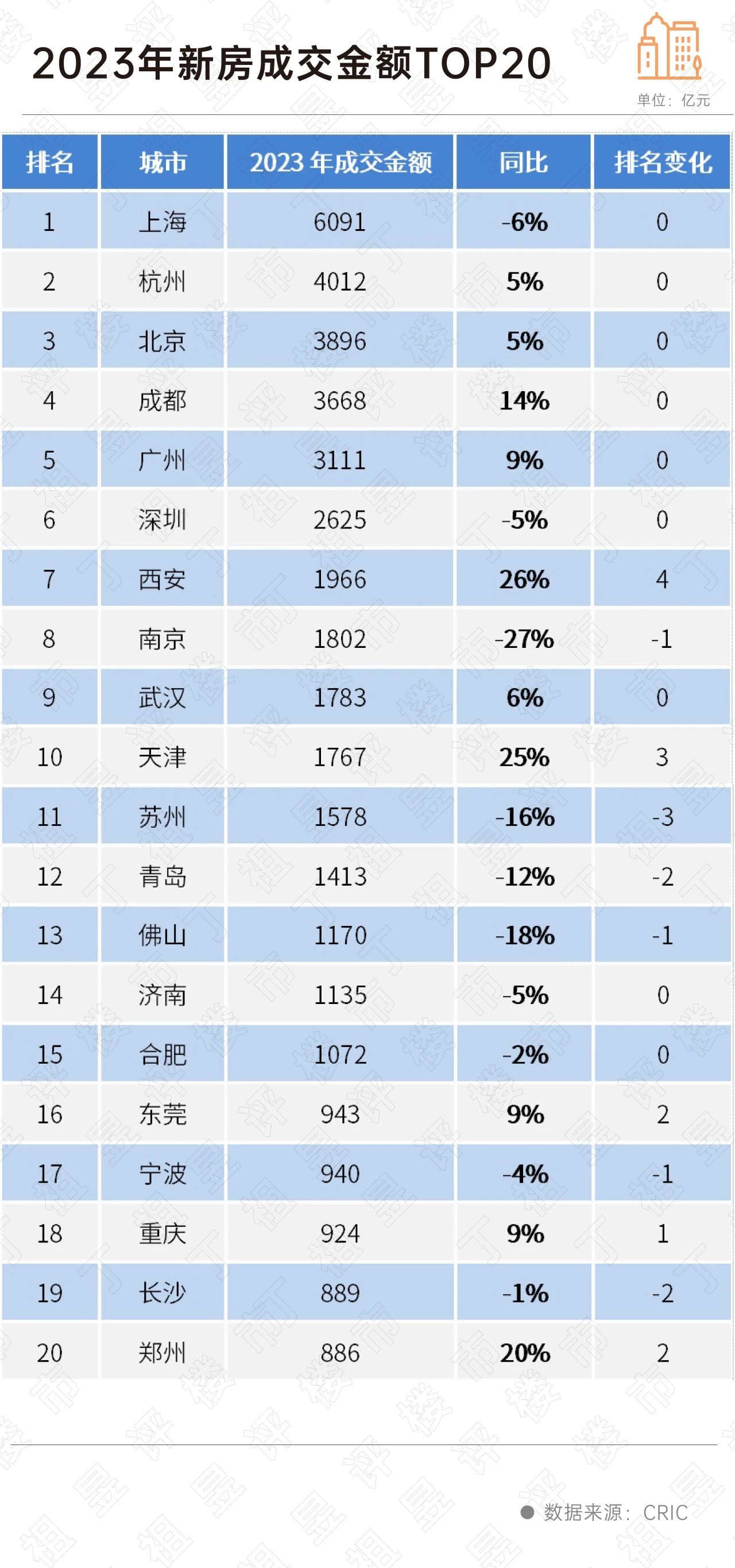 2023年新房成交金额最高的城市是上海,全年成交金额达到6091亿元,成交金额比排在第二位的杭州多出一个“西安”。
