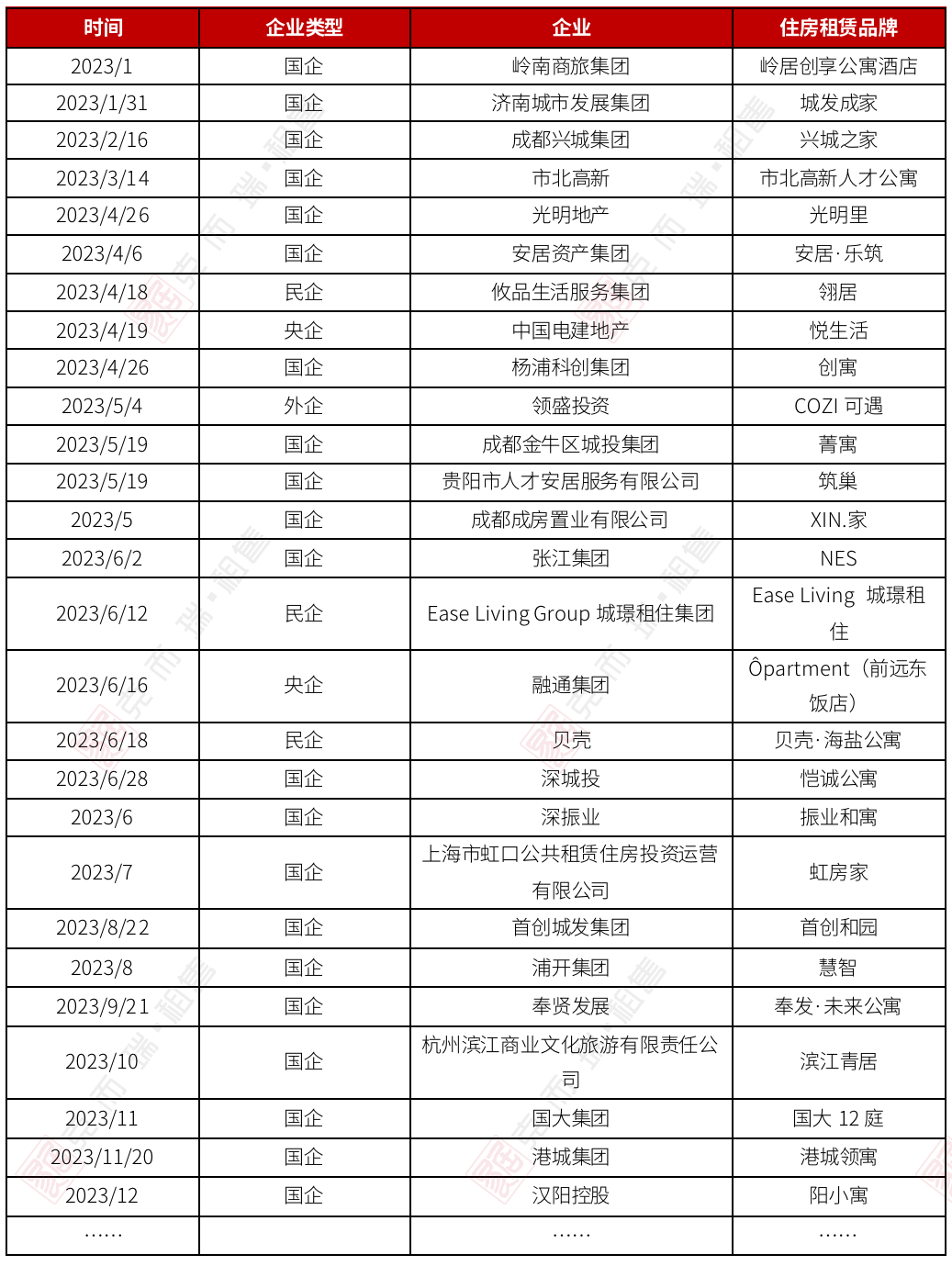 2023年第四季度, 国企新租赁住房品牌陆续进入租赁市场,上海港城开发集团发布住房租赁品牌“港城领寓”,浙江国大集团推出长租公寓品牌“国大12庭”,武汉市汉阳控股集团率先在全市区级层面实现品牌化运营,创建“阳小寓”租赁住房品牌。