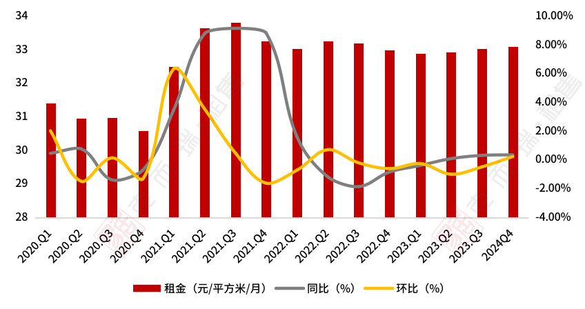 聚焦市场租金表现来看,相较于第三季度,第四季度租金水平整体较为平稳,有小幅回升。2023年Q4全国55城个人房源租金为33.09元/平方米/月,环比微涨0.22%,同比来看,上涨0.34%。全年来看,2023年全国55城个人房源平均租金坪效为33元/平米/月,相较于2022年全年租金坪效均值33.10元/平米/月,小福下滑。整体来看,由于保租房及市场化租赁房源的供应提升及机构化房源品质的提升,个人租赁市场租金上涨缺乏动力,预计未来数月租金也将小幅下降。