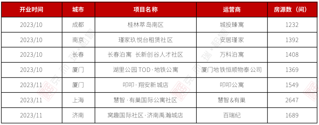 2023年Q4又有大量的新建、存量改建的租赁大社区建成入市,根据不完全统计,超过1000间的大型租赁社区项目有7个,房源量达1.12万间,分布于上海、厦门、南京、济南和成都。