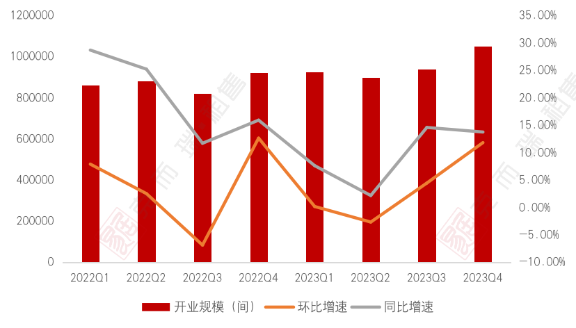 2023年四季度TOP30企业开业规模首次超100万间,相较于2023年Q3的94万间,环比增长11.78%,相比2022年年底的92万间,同比增长13.72%。值得一提的是,四季度各地大型租赁社区和人才公寓项目入市,对季度规模的提升作用极大。