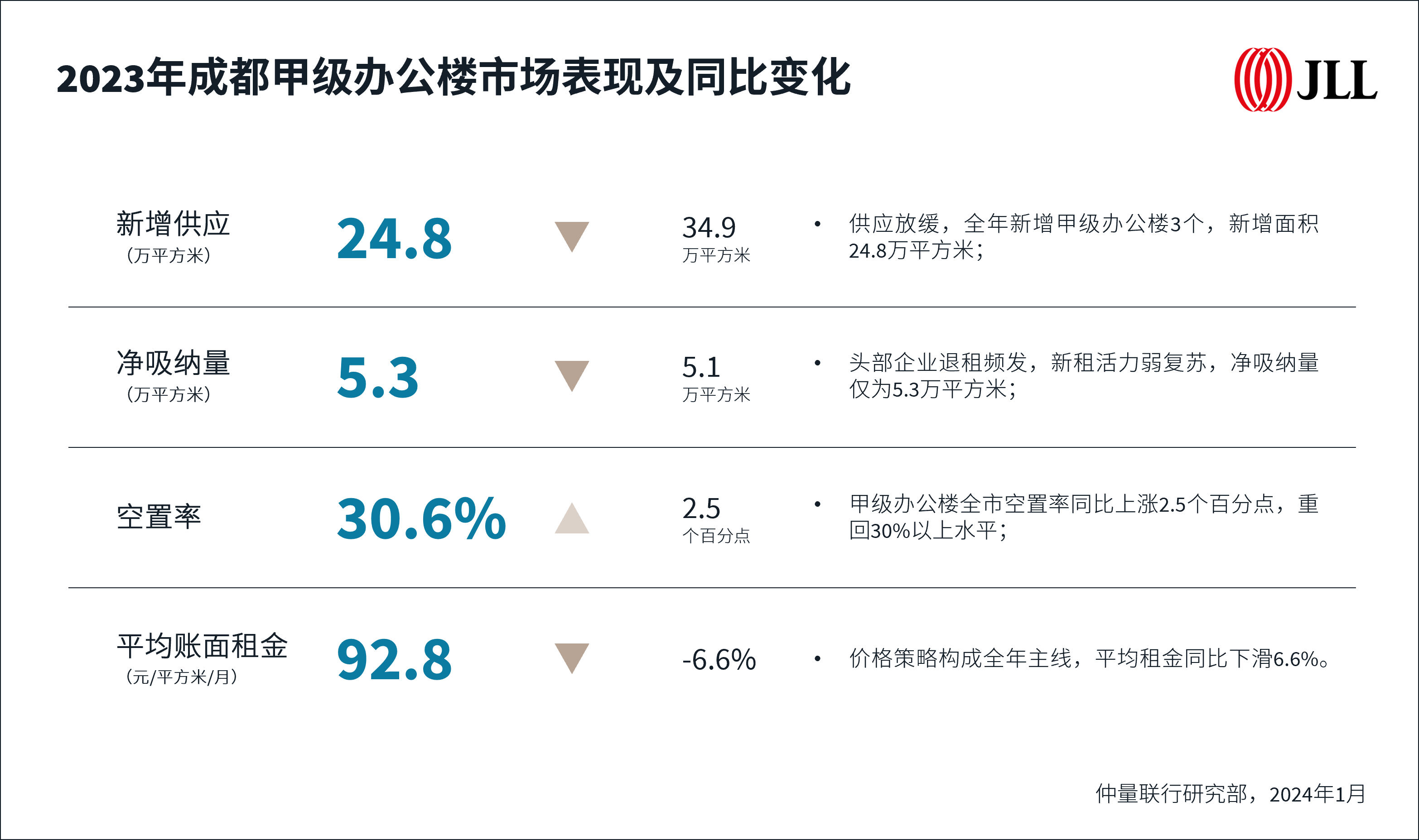 1月24日,仲量联行发布《2023年成都商业及物流地产市场报告》。回顾2023,经济结构性复苏,产业招引复常,零售消费回暖,赛事经济、演艺经济、节假日经济激发城市活力。甲级办公楼市场:净吸纳量低于年初预期,增量需求呈现结构性特征,部分行业退租频发,办公楼租金加速下滑。零售物业市场:零售消费整体回暖修复,空置率同比回落,但空置压力犹存,餐饮和体验业态增量需求表现稳健,改造和非标零售项目成为全年供给侧亮点;需求侧,节假日经济与赛事演艺市场活跃度超预期,带动旅游市场快速回暖,激活消费新增长点。物流地产市场:高标准仓储物流平均空置率回落至历史新低,市场供需结构持续优化,成都西部交通物流枢纽地位突显,迈向内陆开放新高地。