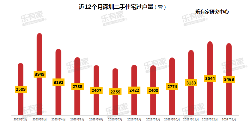 2024年1月,深圳全市二手房成交3463套,与去年同期相比大幅度上涨149%;一手住宅成交1788套,环比下跌30%,同比上涨10%,是近12个月的最低值。