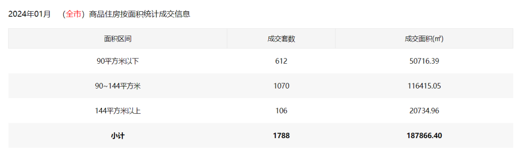 据官方信息显示,2024年1月深圳成交的1788套新房,90-144㎡改善型产品成交1070套,占总量的59.8%;90㎡以下的户型次之,占全市总量的34.2%;144㎡以上的产品成交106套,占总量的6.0%。