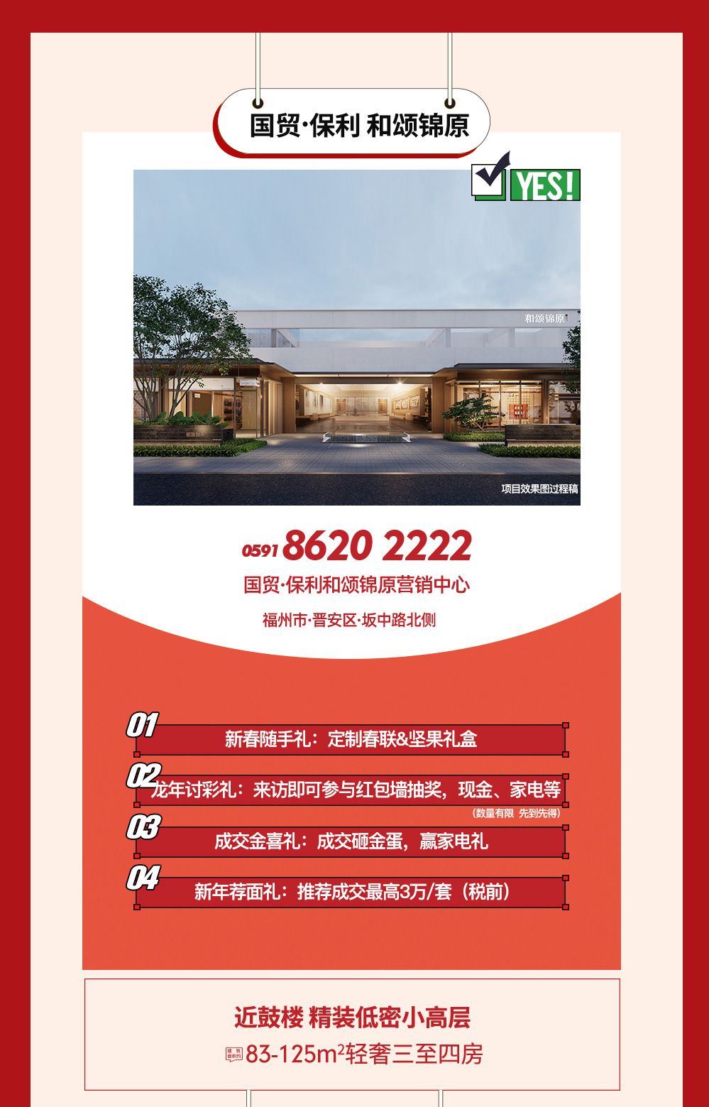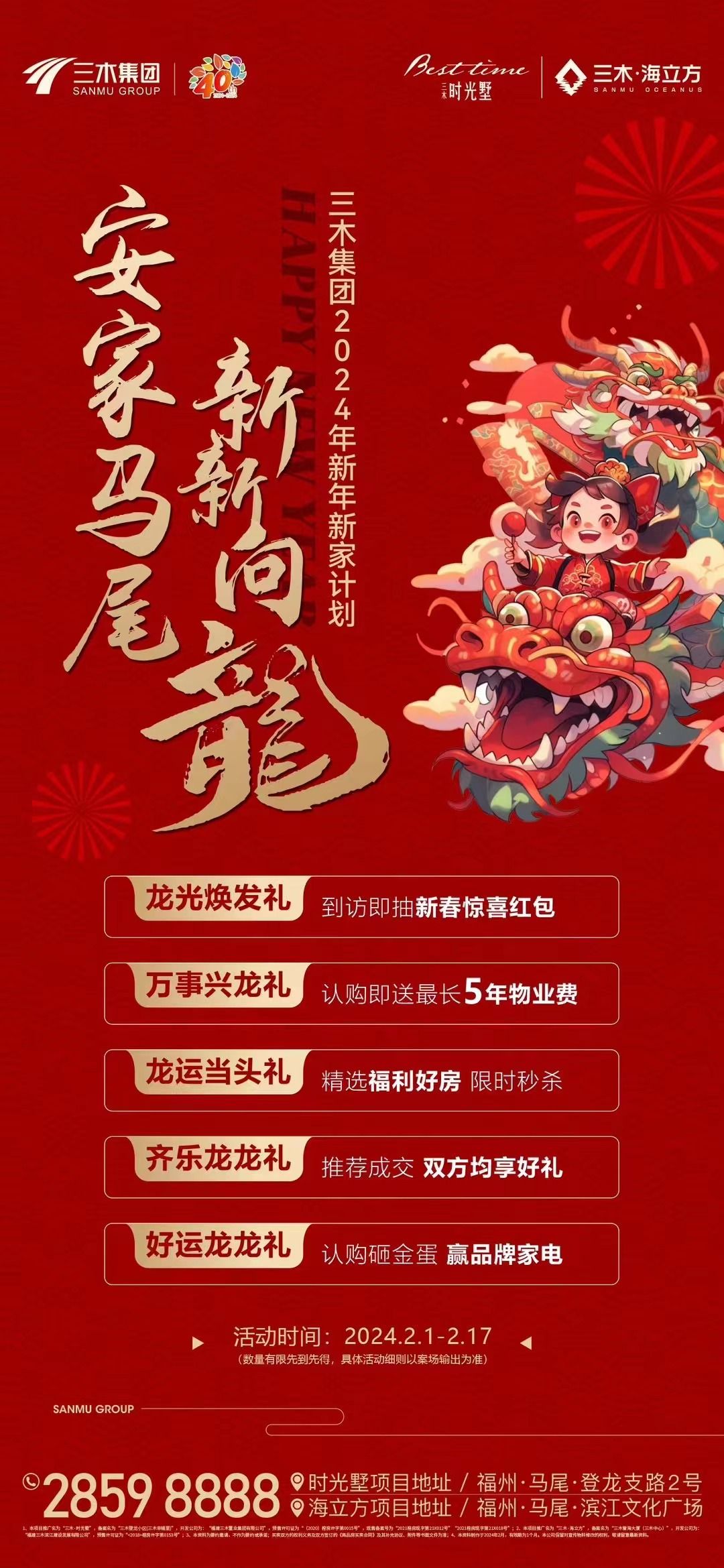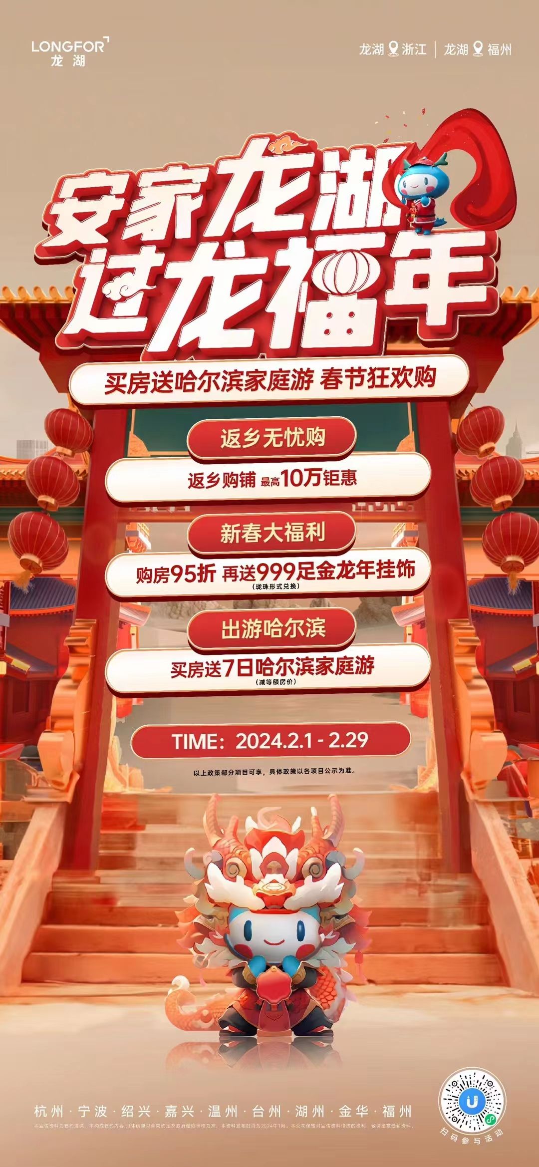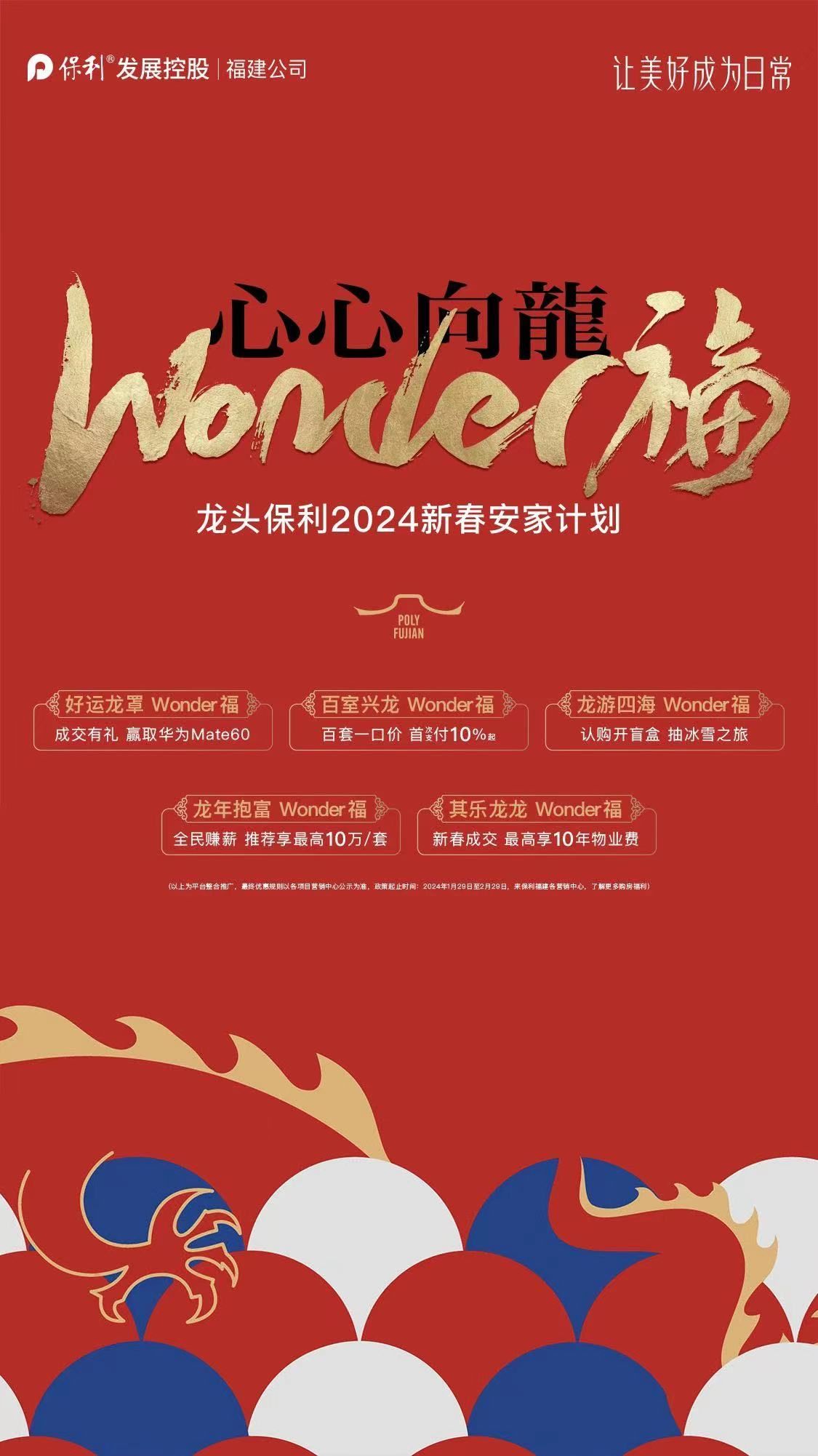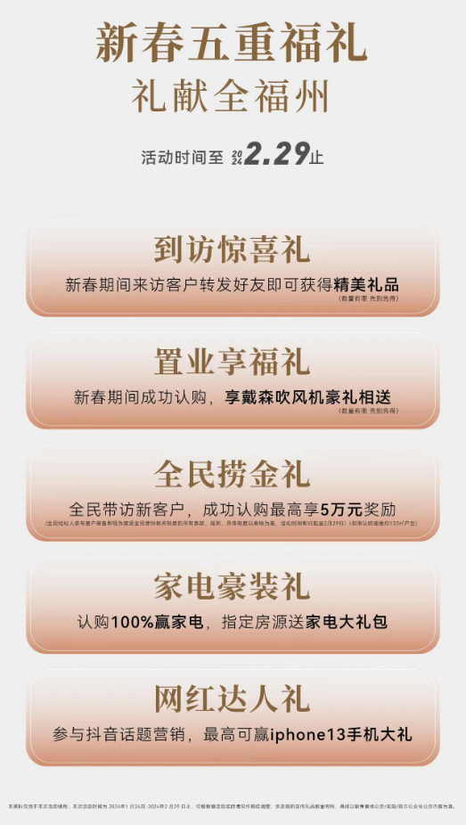(最终优惠规则以各项目营销中心公示为准,政策起止时间:2024年1月29日至2月29日,来保利福建各营销中心,了解更多购房福利)。
