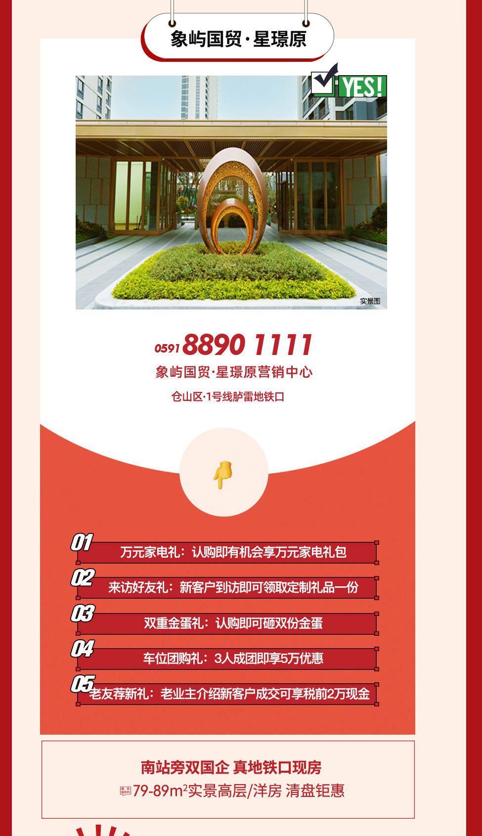 南站旁双国企,真地铁口现房,建筑面积约79-89㎡实景高层/洋房,清盘钜惠。万元家电礼: 认购即有机会享万元家电礼包;
