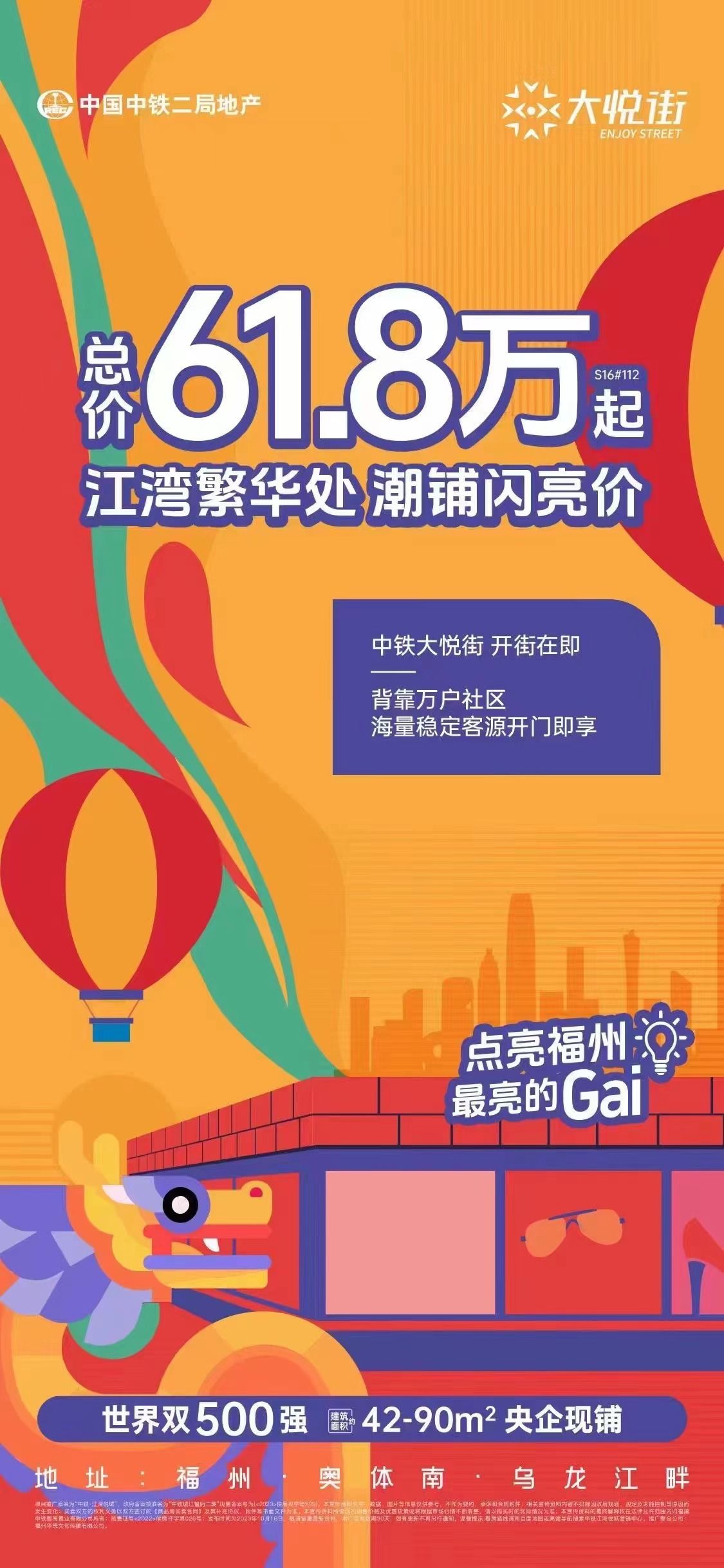 总价61.8万起,潮铺闪亮价,建筑面积约42-90㎡央企沿街现铺。