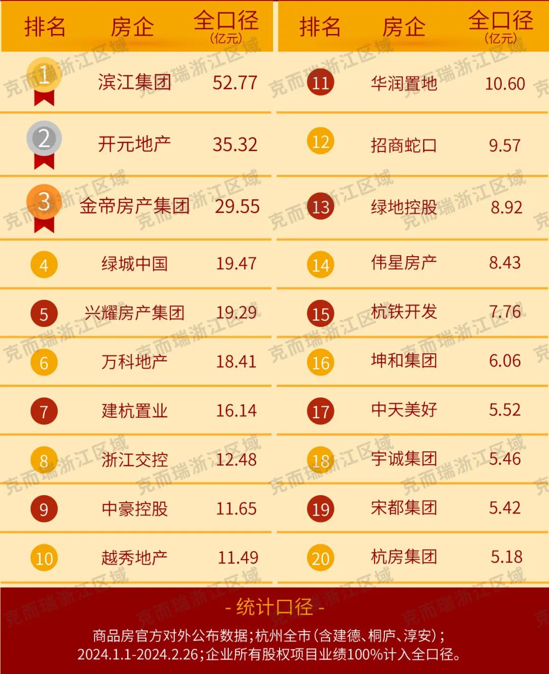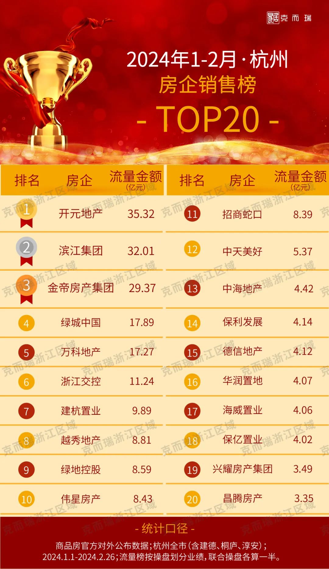 恭喜滨江集团、开元地产、金帝房产集团跻身1-2月杭州房企销售全口径榜三强!