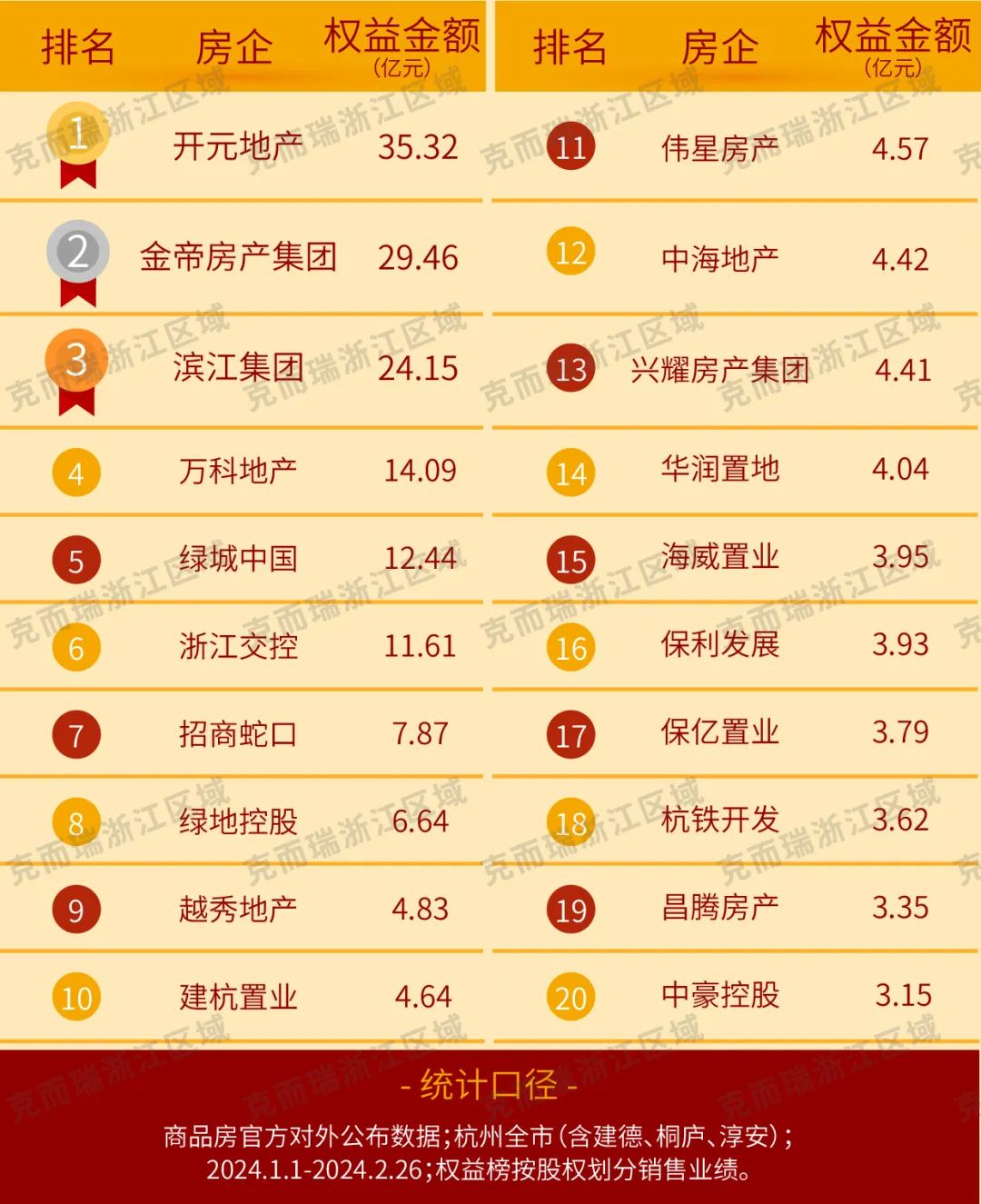 恭喜开元地产、金帝房产集团、滨江集团位列1-2月杭州房企销售权益榜前三!