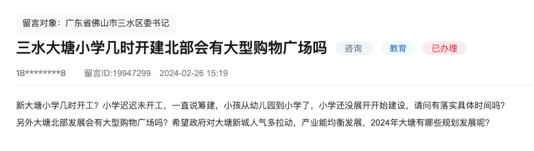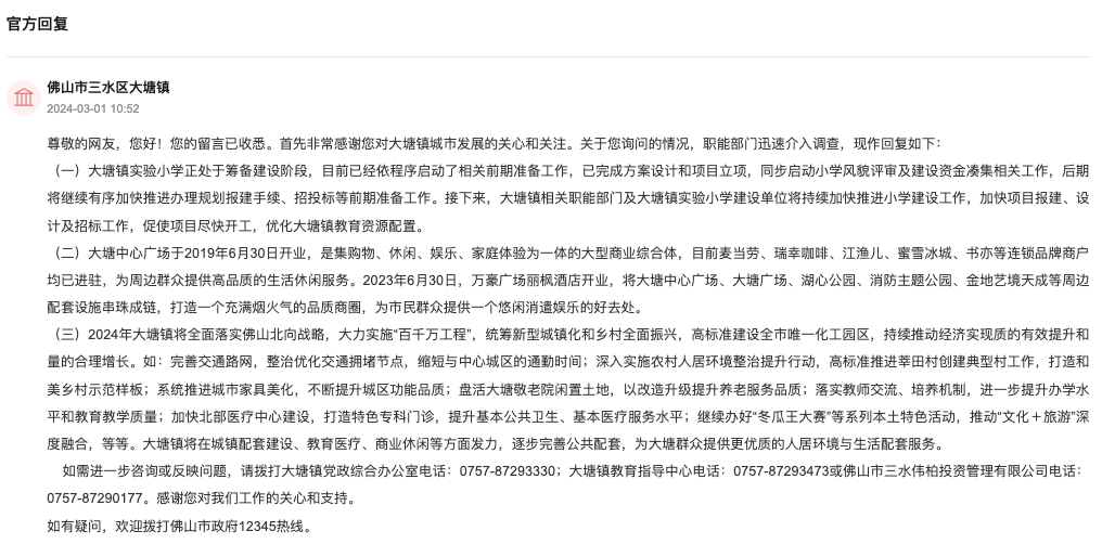 日前,有网友在人民网领导留言平台上提问,三水大塘小学几时开建?北部会有大型购物广场吗?