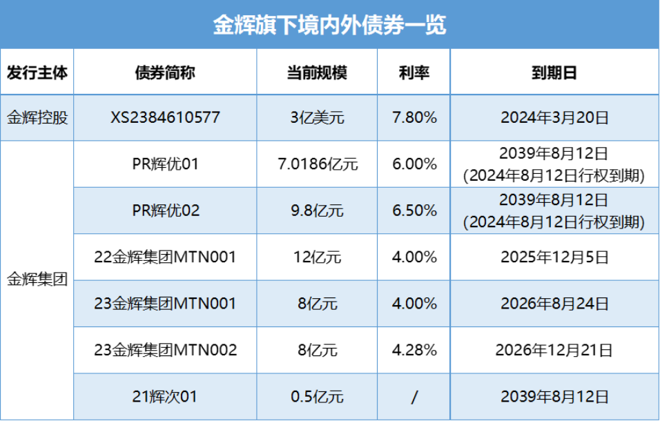 除此之外,数据显示,除本次到期的3亿美元境外债,金辉控股旗下暂无境内外债券,但作为同一发行主体,金辉集团旗下仍有6笔境内债券,总金额为45.31亿。