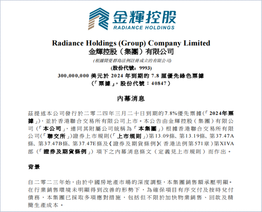 3月20日,金辉控股发布消息称,一笔到期的3亿美元票据未能按期偿还。这笔利率为7.8%的优先票据所有未偿还本金及其任何应计及未付利息于2024年3月20日到期并须予支付。