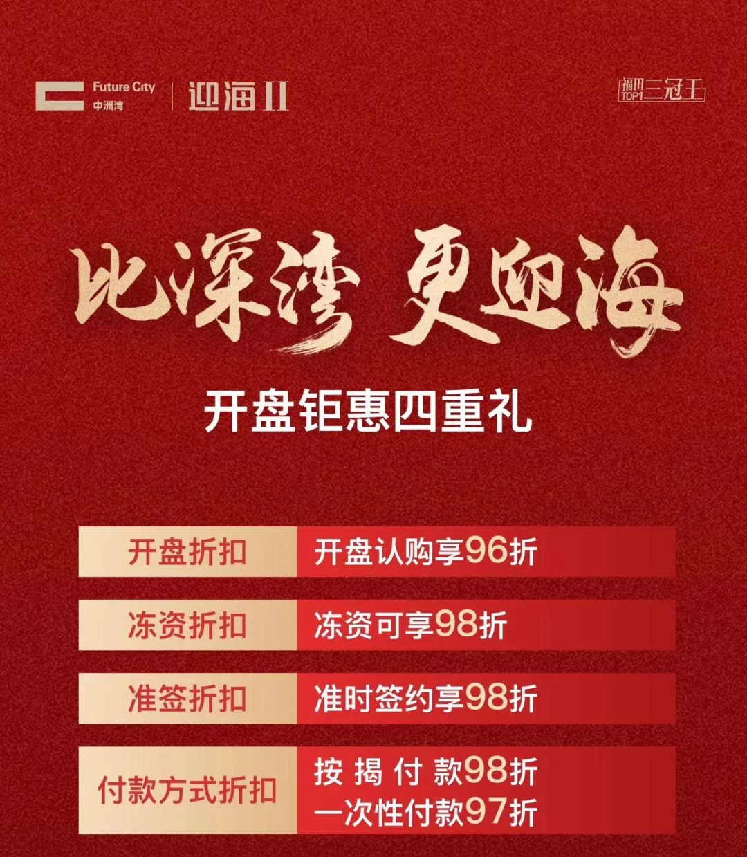 即便是福田三冠王中洲湾迎海,号称“龙华宝安预算买福田”,开盘88折总价660万起买精装三房,相比一期,今年推售的二期产品还送装修。