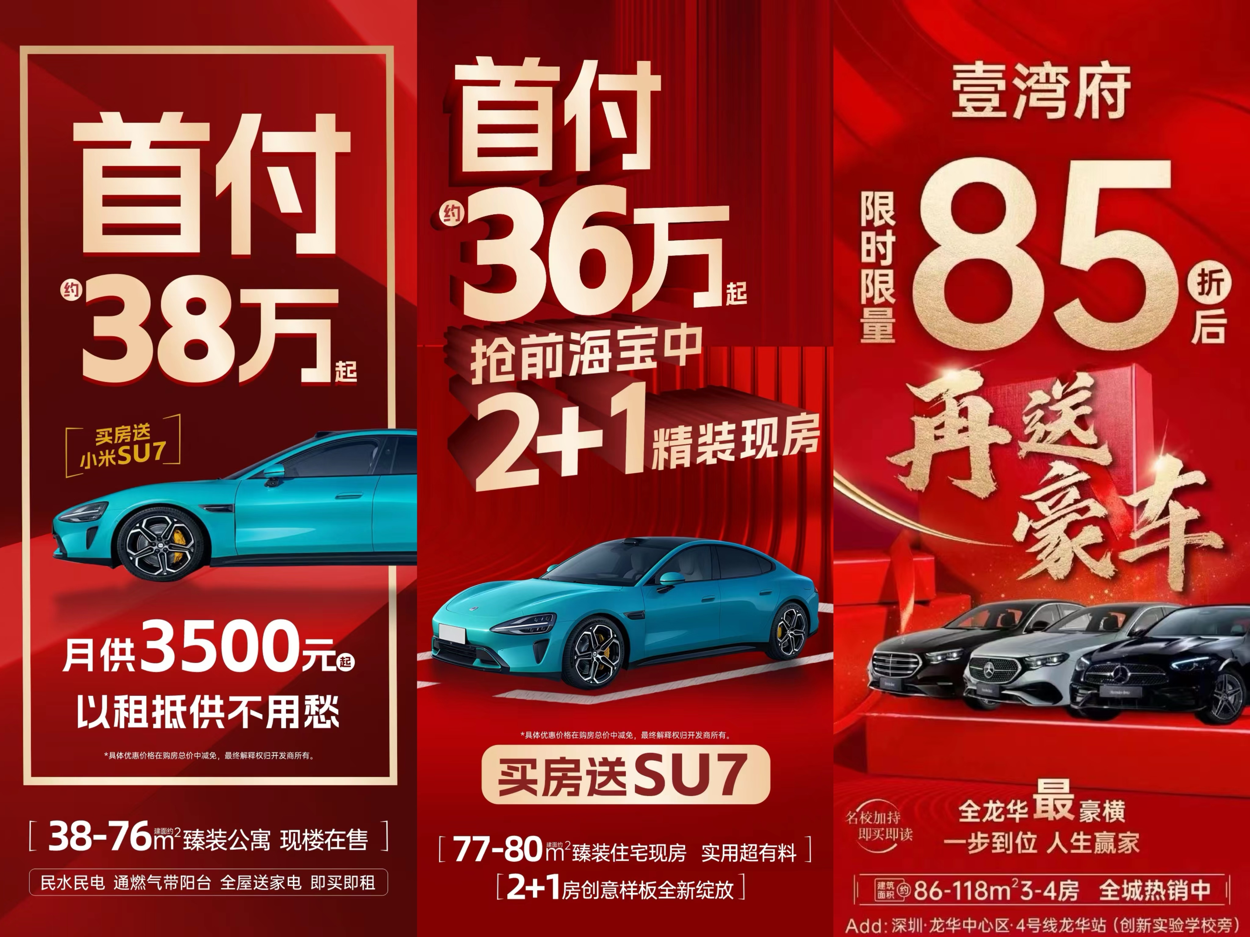 龙华中心的壹湾府,买房85折后再送豪车,并且近日官宣即将加入“以旧换新”队列;宝安固戍的京基智农山海公馆,现在买房送小米SU7。