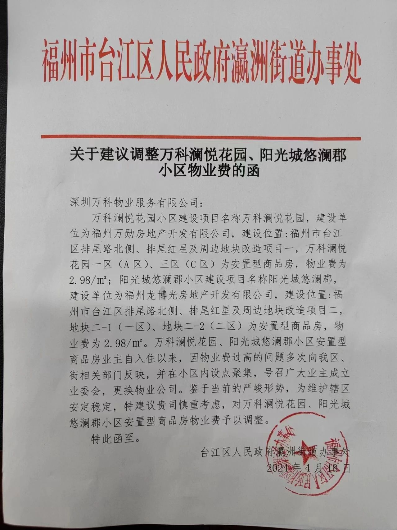 4月18日,网络上一则《关于建议调整万科澜悦花园、阳光城悠澜郡小区物业费的函》广泛流传,落款单位为福州市台江区人民政府瀛洲街道办事处。