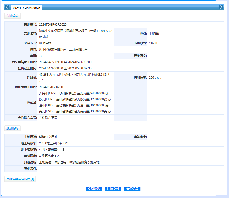济南中央商务区西片区城市更新项目(一期)DMLX-02-05地块(茂陵西A5地块)吸引了金茂、瑞马、保利置业参拍,起拍价14000元/㎡,地上最大2.9容积率,经2轮竞拍,最终由保利置业斩获,成交价47455万元,溢价率0.42%,楼面价14059元/㎡。