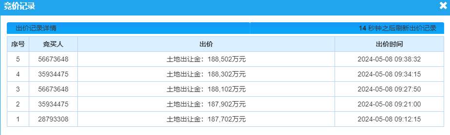 潘田城中村改造项目B-1地块吸引了瑞马、保利置业、绿城、金茂4家房企参与,经过5轮竞拍,最终瑞马成功拿地,成交价188502万元,溢价率0.43%,折合楼面价7570元/㎡。