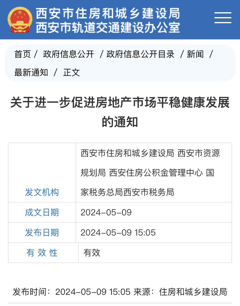 5月9日,西安市住房和城乡建设局等部门发布关于进一步促进市场平稳健康发展的通知,全面取消本市住房限购措施,居民家庭在全市范围内购买新建商品住房、二手住房不再审核购房资格。