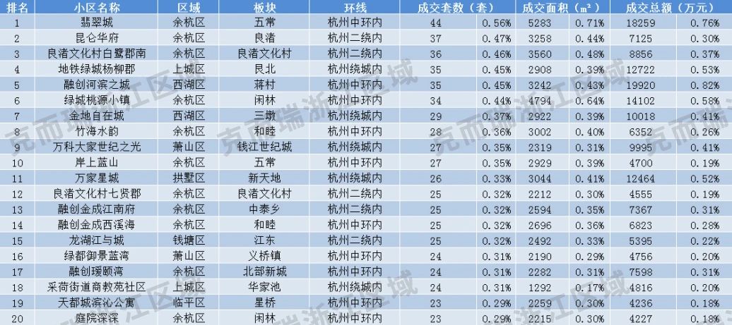 4月杭州二手住宅成交TOP20小区合计成交房源576套,总成交面积为57493㎡,总成交额约为17.43亿元,成交均价为30314元/㎡。